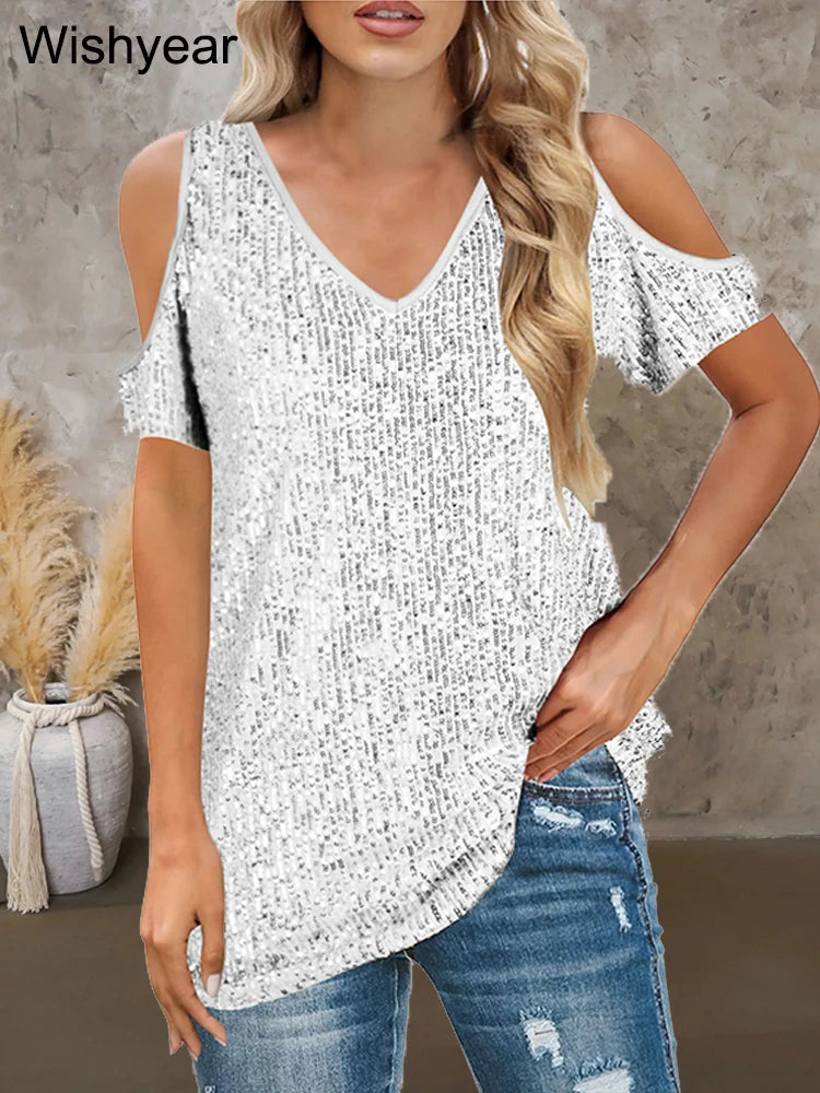 Elevate your wardrobe with our Luxury Sequin Patchwork Woman's Top. This V-neck design features exquisite sequin detailing on premium polyester-spandex blend fabric, offering slight stretch for a comfortable straight fit. The drop sleeve styling and regular length create a flattering silhouette perfect for evening events or upscale casual settings. Released for Summer 2025, this sophisticated piece embodies classic style with a contemporary edge.