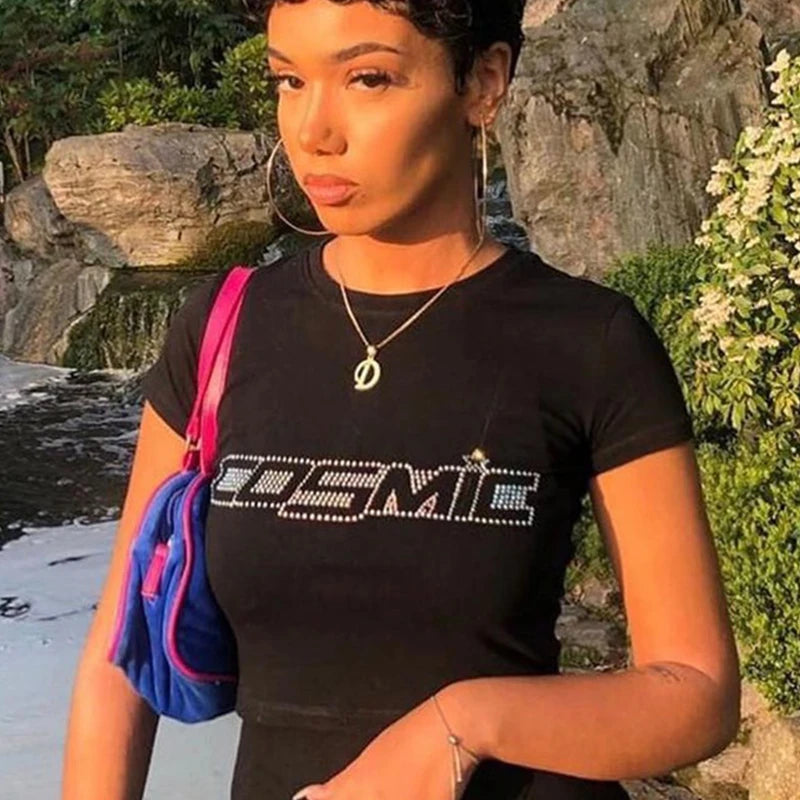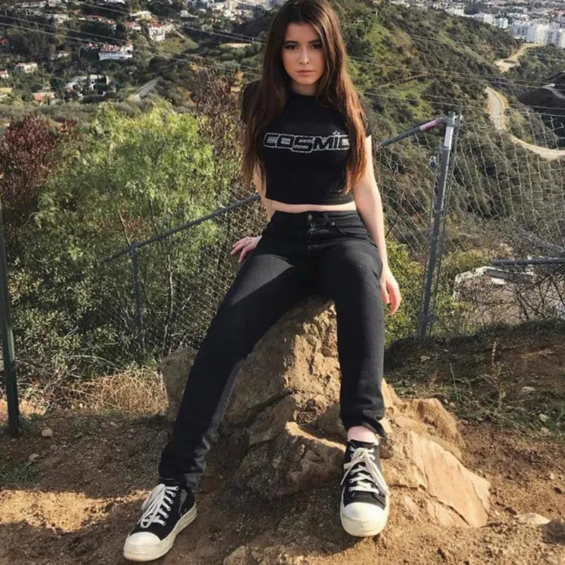 This Women Cosmic Graphic Summer Top combines punk style with a comfortable, skinny fit designed for ages 18-35. Made from breathable polyester and nylon broadcloth, it features a short length and regular short sleeves, perfect for summer wear. The O-neck collar and comic letter pattern with diamond decoration add a unique, edgy touch. True to size, this tee offers both style and comfort for everyday casual or statement looks.